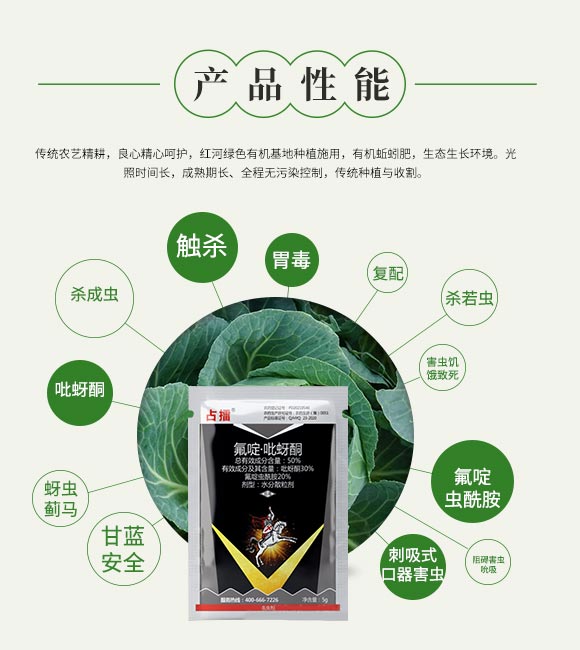 本品是由氟啶蟲酰胺和吡蚜酮復(fù)配而成的殺蟲劑,氟啶蟲酰胺其作用機(jī)理是通過阻礙害蟲吮吸作用,使害蟲攝入藥劑后很快停止吮吸,導(dǎo)致饑餓而死,具有觸殺和胃毒作用。吡蚜酮其作用機(jī)理獨(dú)特,成蟲和若蟲接觸藥劑后,產(chǎn)生口針阻塞效應(yīng),停止取食為害,饑餓致死。按登記劑量使用時(shí),對(duì)甘藍(lán)蚜蟲、薊馬有較好的防治效果,且對(duì)甘藍(lán)。