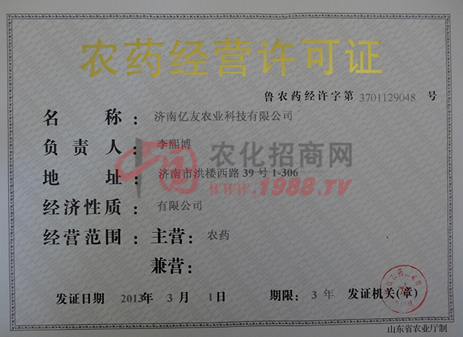 濟(jì)南億友農(nóng)業(yè)科技有限公司成立于2006年12月6日,公司前身是山東大學(xué)科貝爾生物工程有限公司(濟(jì)南金科生化有限公司)的研發(fā)中心,2009年經(jīng)過重組改成了股份制公司。公司現(xiàn)擁有資深農(nóng)業(yè)專家2名,農(nóng)藥化工高級工程師、化學(xué)博士指導(dǎo)數(shù)名,研究生數(shù)名,技術(shù)力量雄厚。公司目前主推佳圣®牌、億友嘉田®牌,科巧®套餐系列30%毒死蜱微膠囊懸浮劑花生、土豆、大蒜拌種劑系列,以及蘇寬®,百凈®,全奪®(8000iu/ul蘇云金桿菌懸浮劑)全能殺蟲劑系列,其具有性高、持效期長、殺蟲譜廣等特點(diǎn),公司近還推出了蘇線丹®等高效低毒殺蟲、殺線蟲劑等產(chǎn)品,好產(chǎn)品不斷推出中,公司法人李熙博竭誠歡迎您的到來。